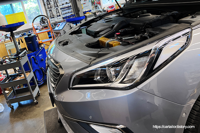 다시 차를 올리고 하부 작업부위가 깨끗한 것을 확인합니다. 지난 오일교환 흔적들로 오일때가 가득하던 필터 부근은 작업 전 보다 더 깨끗해졌습니다.