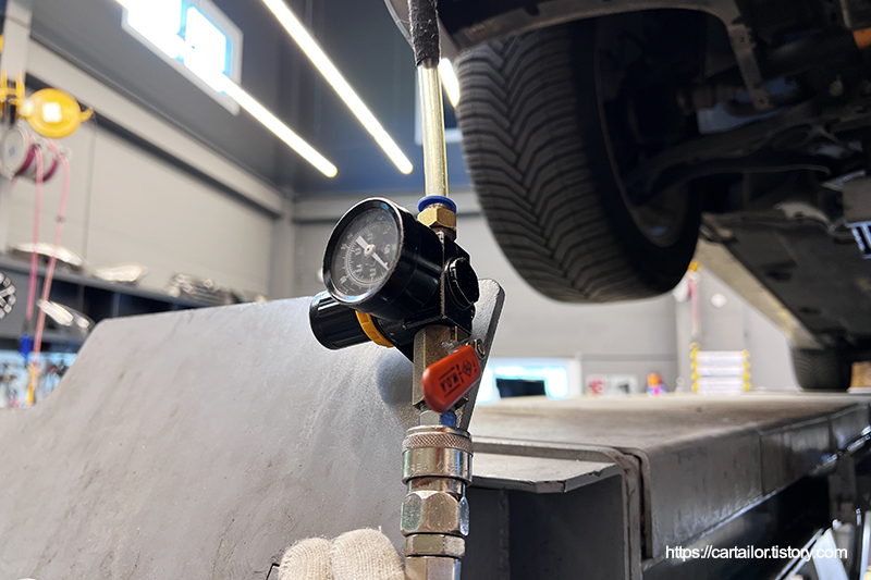 엔진 세정제를 돌릴 동안 제거했던 잔유 제거용 어답터와 호스를 다시 설치 후 차량을 리프팅합니다.