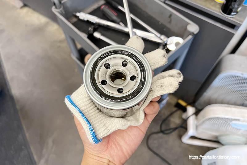 오일필터에는 신유를 잘 발라 규정된 조입값으로 정확하게 잠가 줍니다.