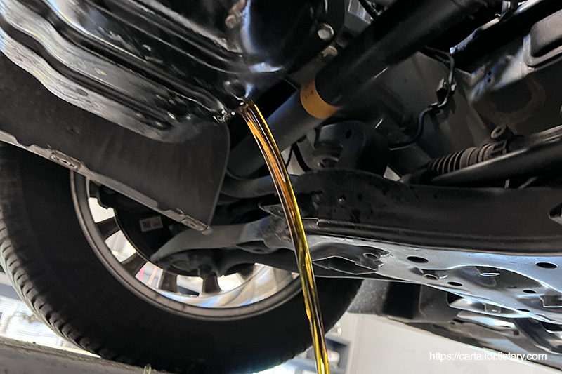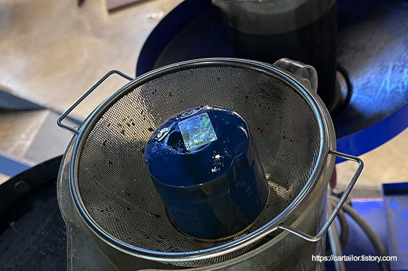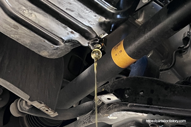 드레인볼트를 열어 사용유를 배출시켜 줍니다. LPG를 연료로 하는 차량의 경우 부취재 성분인 Ethyl Mercaptan과 사용유의 고온반응으로 인해 붉은색을 띄는 특징이 있습니다.