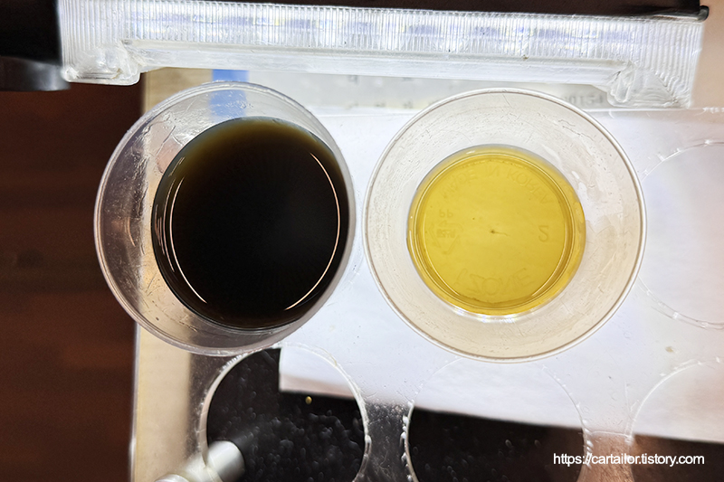 좌측부터 기존 사용유, 레벨링 시 배출된 오일로 우측이 현재 차량의 변속기 오일 상태로 보시면 되겠습니다.