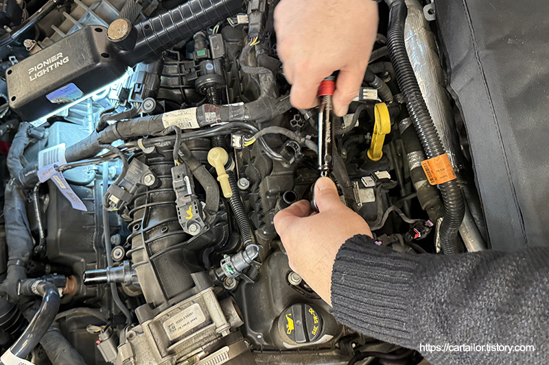 탈거했던 점화코일을 장착 후, 토크렌치를 이용해 규정 토크로 체결합니다.