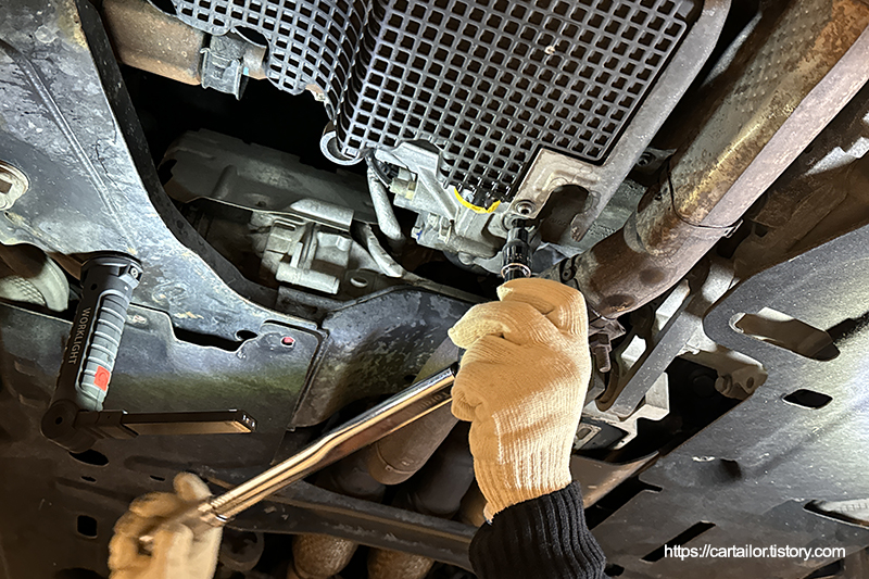 배출이 완전히 끝났으면 세척 및 건조가 끝난 드레인플러그를 손으로 돌려준 후, 토크렌치를 이용해 규정 토크로 체결합니다.
