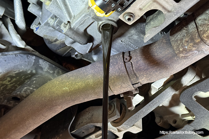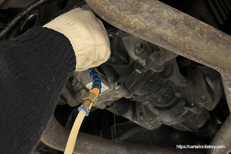 플러그를 개방 후, 오일을 석션합니다. 해당차량의 경우 디퍼런셜은 구조 상, 배출되는 플러그가 없기 때문에 석션 방식으로 기존 오일을 제거해야 합니다.