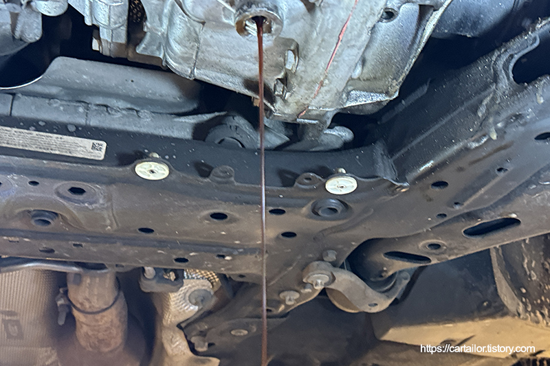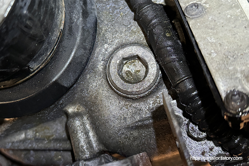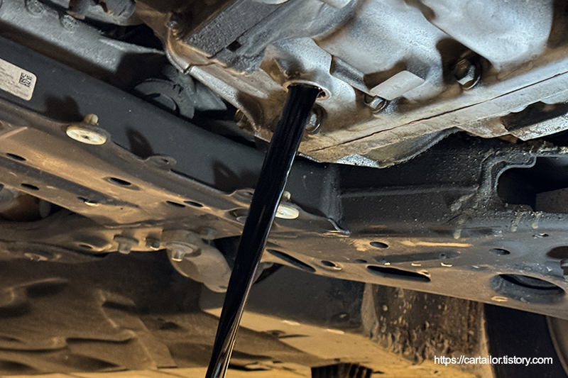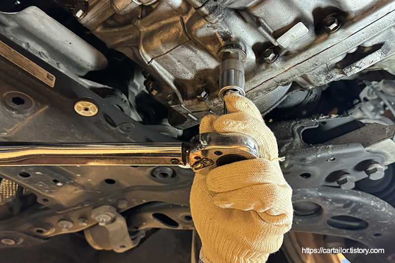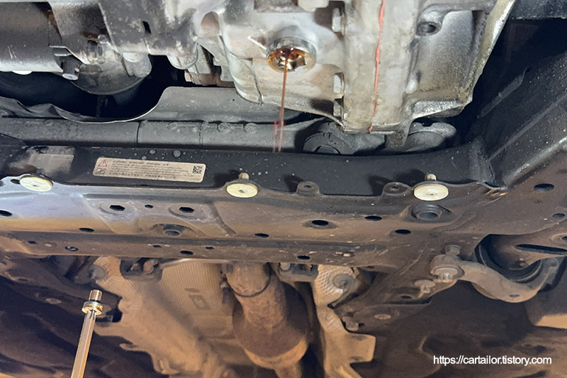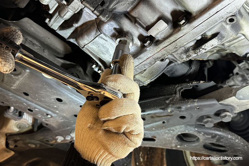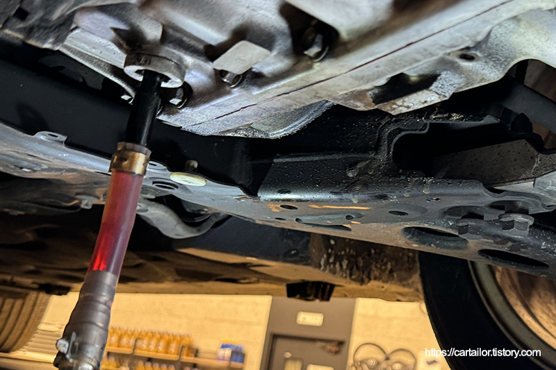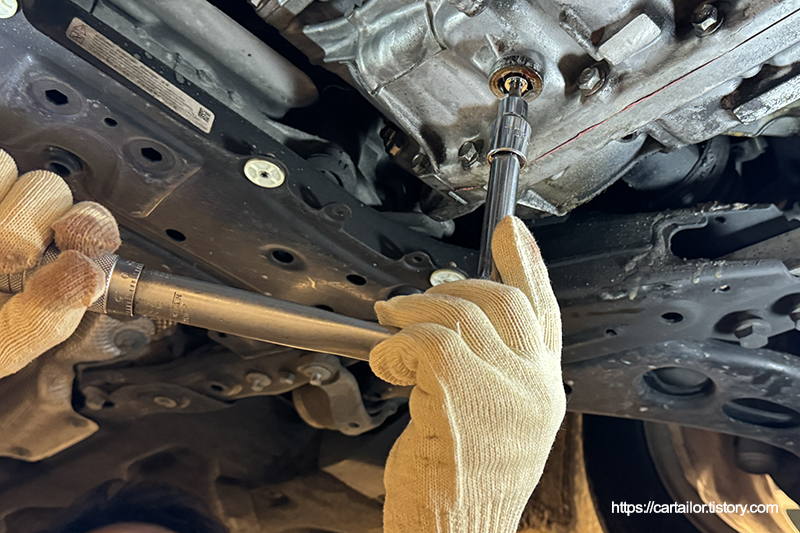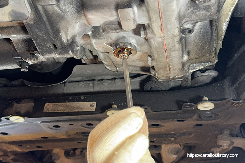 배출이 끝났으면 기존 드레인볼트를 규정값으로 정확하게 잠가 줍니다.