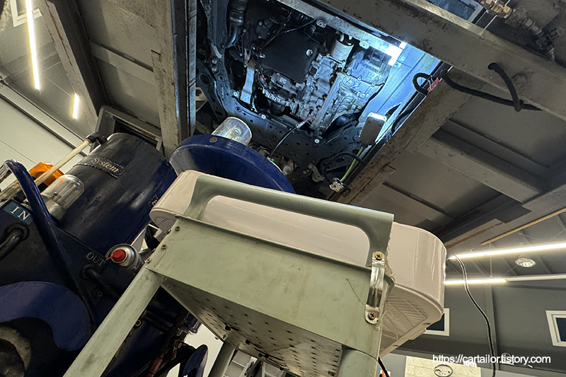 전용 어답터를 장착 후, 신유를 주입합니다. 시동을 걸어 변속 시퀀스를 진행 후 어느정도 온도가 올랐으면 시동을 꺼 2회차 배출을 진행합니다.
