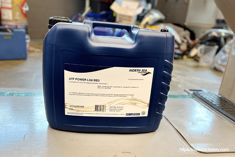 준비한 변속기 오일입니다. 아이신이라고 해서 다 같은 규격이 적용되지는 않습니다. 과거 아이신 변속기 오일은 3309규격이 대체적으로 통용되었으나, 2010년 쯤을 기점으로(EURO 4, 5로 넘어오는 시점-자동차 모델 마다 다름) 아이신 6단 차량 및 8단 차량 들까지 JWS3324 (NIPPON-AW1) 규격으로 변경되기 시작합니다. 두 규격은 상호 호환성이 없으며, 변경된 규격은 ZF 6단 전용오일과 비슷한 특성을 갖는 저점도이기 때문에 구형 차량에 사용할 경우 이상 증상을 수반하거나 변속기 내구성 저하를 야기할 수 있고 반대로 3324 규격을 요하는 최신 차량에 3309를 주입하는 경우 변속충격, 무거움 및 유온의 과열과 이에 따른 슬립현상 등의 불편한 증상을 야기할 수 있습니다.