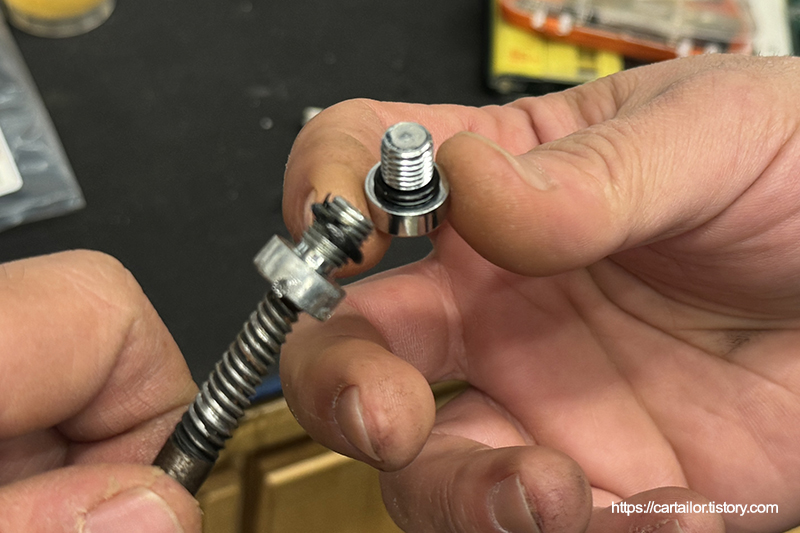 제거된 볼트에서 백탭으로 고착된 레벨링볼트를 제거 후 신품 볼트를 넣어 줍니다.