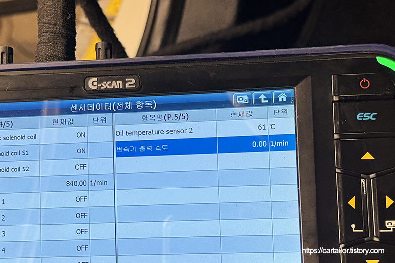 입고 직후 확인한 미션오일 온도로, 유온이 높아 다른 작업 먼저 진행합니다.