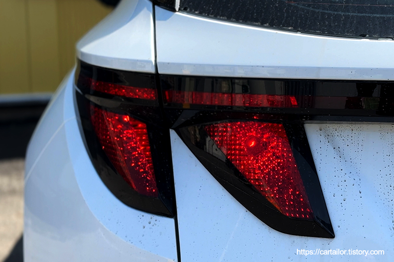 헤드라이트의 경우 할로겐이 사라졌지만 후면부의 경우 여전히 할로겐이 기본이며 상위 모델에서만 LED가 장착되고 있습니다. 해당 차량은 기본 할로겐 사양으로, 좌측은 미등, 우측은 정지등 점등 시 모습입니다. 투싼 특유의 일자 미등라인이 없는 것은 물론이고 정지등 점등 시, 아웃사이드에서만 들어오게 되어 있습니다. 디자인적인 측면 그리고 시인성 측면에서 할로겐 전구 타입은 여러모로 아쉬운 점이 많습니다.