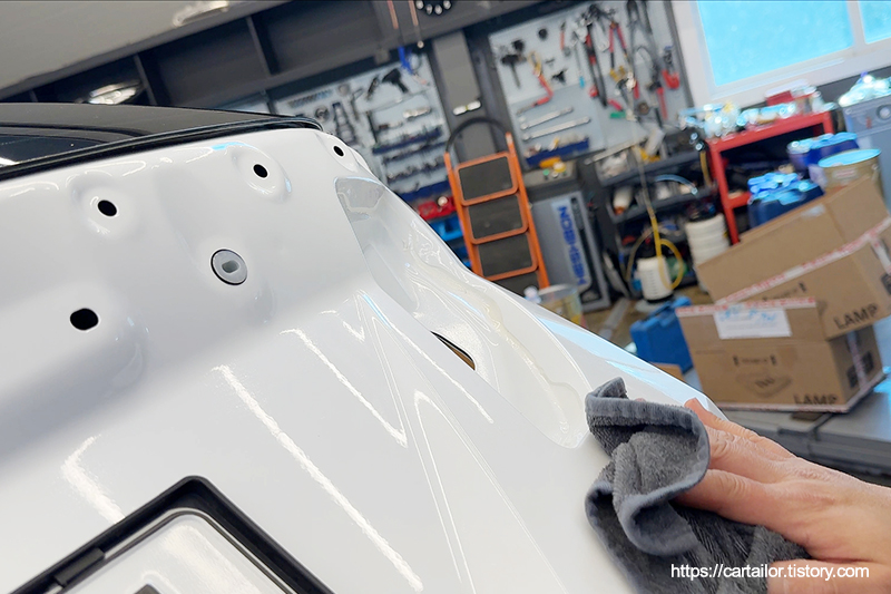 마스킹을 한 뒤, 아웃사이드 램프와 백패널, 인사이드 램프를 탈거합니다. 탈거되면 평소에는 보이지 않던 철판이 외부에 노출되는데요, 이번 기회에 깨끗하게 닦아 줍니다.