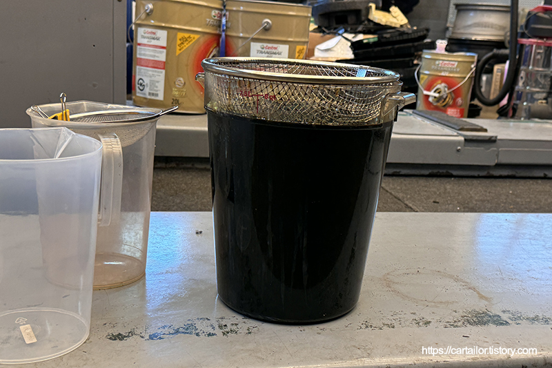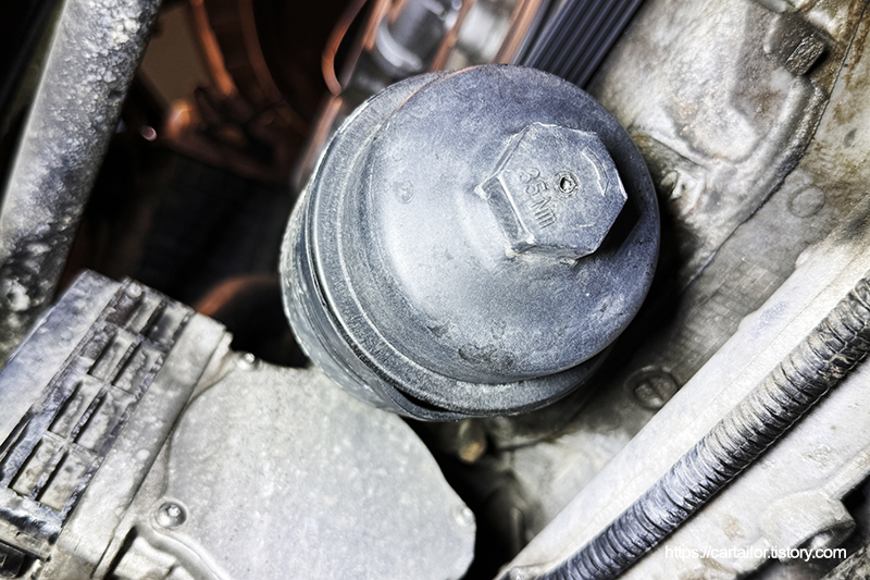 잔유가 배출되는 동안 오일필터를 준비하고 신유를 잘 발라 손으로 잠가 준 뒤 토크렌치를 사용하여 마무리 체결을 합니다.