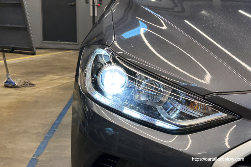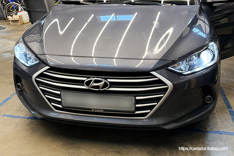 세월이 지남에 따라 수명을 다해가 급격하게 어두워지고 노랗게 변한 동승석HID 전구를 교체하기 위해 입고된 아반떼AD 1.6 GDI 모델입니다. 교체 이력이 없는 운전석도 함께 교체합니다.
