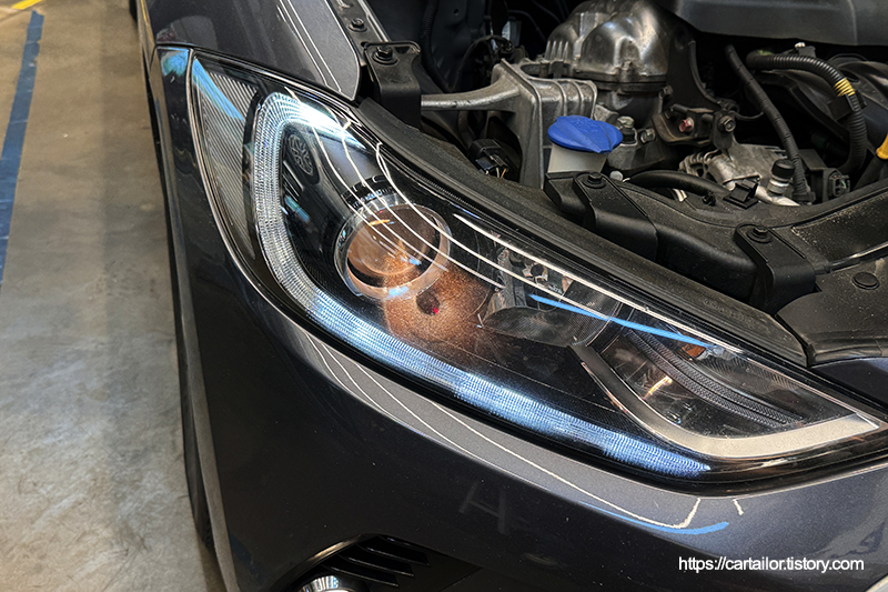 세월이 지남에 따라 수명을 다해가 급격하게 어두워지고 노랗게 변한 동승석HID 전구를 교체하기 위해 입고된 아반떼AD 1.6 GDI 모델입니다. 교체 이력이 없는 운전석도 함께 교체합니다.