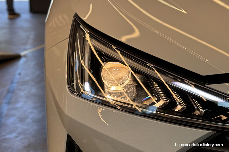 조립을 마친 뒤, 점등 테스트를 시작합니다. 하향등과 상향등 모두 시원하게 잘 들어옵니다. 더뉴아반떼AD와 같은 상하향등일체형 타입 2등식 헤드램프는 상향등에서도 LED 광원을 사용할 수 있습니다.