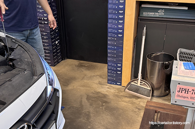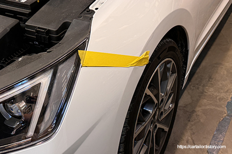 마스킹을 한 뒤, 프론트 범퍼 커버와 양쪽 헤드라이트를 탈거합니다. 더뉴아반떼는 전구 교체를 위한 운전석쪽 공간이 거의 없어 이와 같은 작업이 동반되어야 합니다.