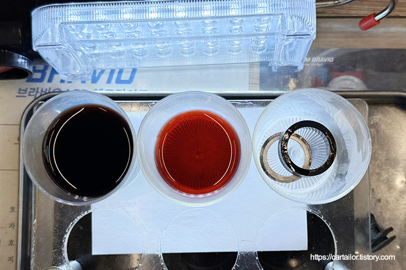 좌측부터 기존 미션오일, 레벨링 시 배출된 오일입니다. 우측이 현재 차량의 변속기 오일 상태로 보시면 되겠습니다.