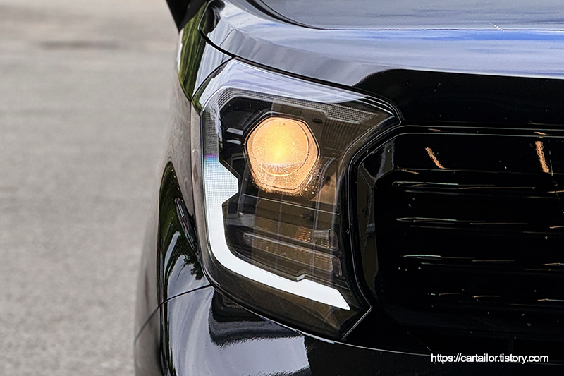 해당 차량을 스타일 패키지가 적용된 모델로, 보시는 것처럼 전조등 점등 시 구슬처럼 동그란 막에서 불빛이 나오는 걸 확인할 수 있습니다. 만약 스타일 옵션을 적용하지 않아 반사판과 전구 내부가 훤히 보이는 사양의 경우, 클리어 타입 전용 LED헤드라이트를 장착할 수 있으니 참고하시면 되겠습니다.