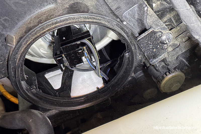 할로겐 전구를 제거 후, 브라비오LED를 설치합니다. 운전석의 경우 전구 교체를 위한 공간이 매우 협소해 헤드라이트 어셈블리 탈거가 동반됩니다.