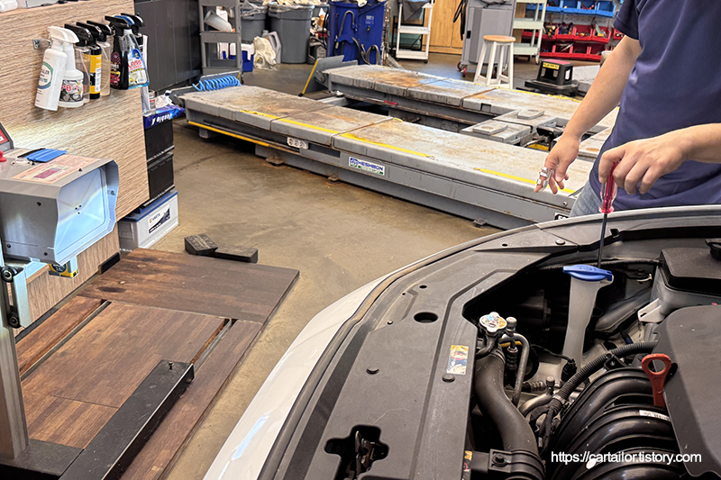 라이트 테스터기를 이용해 광원 변경 효과 극대화 및 맞은 편 차량 눈부심 방지를 위해 조사각을 조절합니다.