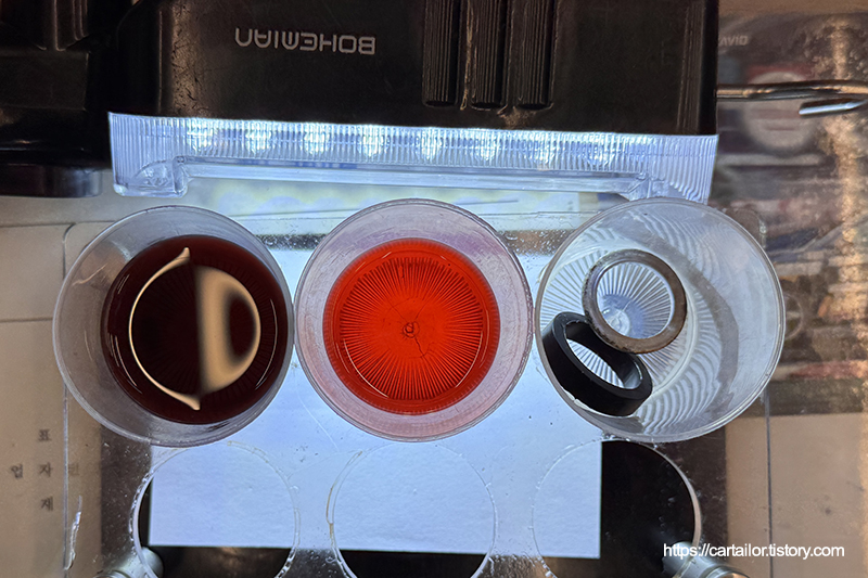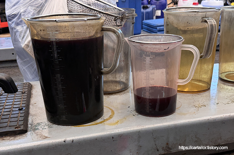 좌측부터 기존 미션오일, 레벨링 시 배출된 오일입니다. 우측이 현재 차량의 변속기 오일 상태로 보시면 되겠습니다.