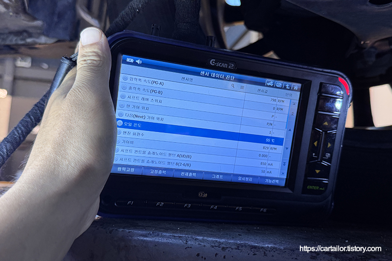 입고 직후 확인한 미션오일 온도입니다. 오일 배출하기엔 유온이 다소 높은 편으로, 팬을 이용해 잠시 식히는 시간을 갖습니다.