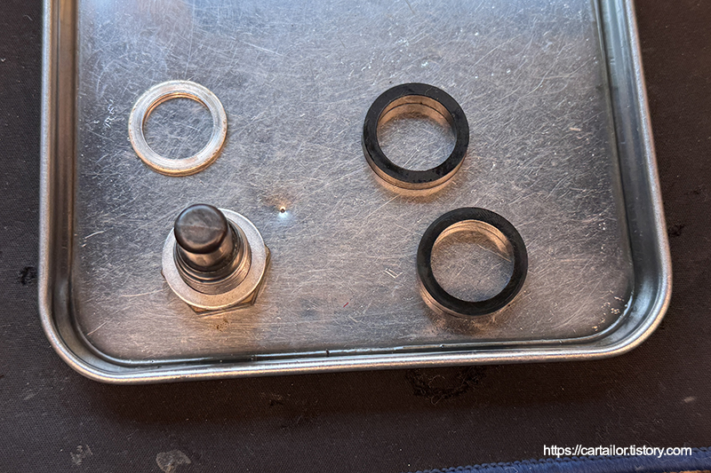 세척 및 건조를 마친 플러그에 신품 와셔를 걸어줍니다. 레벨링플러그 오링도 신품을 준비합니다. 오일 배출이 완전히 끝났으면 플러그를 손으로 돌려준 뒤, 토크렌치를 이용해 규정 토크로 체결합니다.