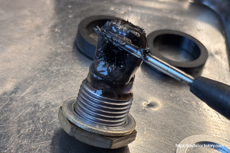 레벨링플러그를 열어 과주입분을 배출시킵니다. 배출되는 동안 레벨링플러그 오링을 신품으로 교체해줍니다.