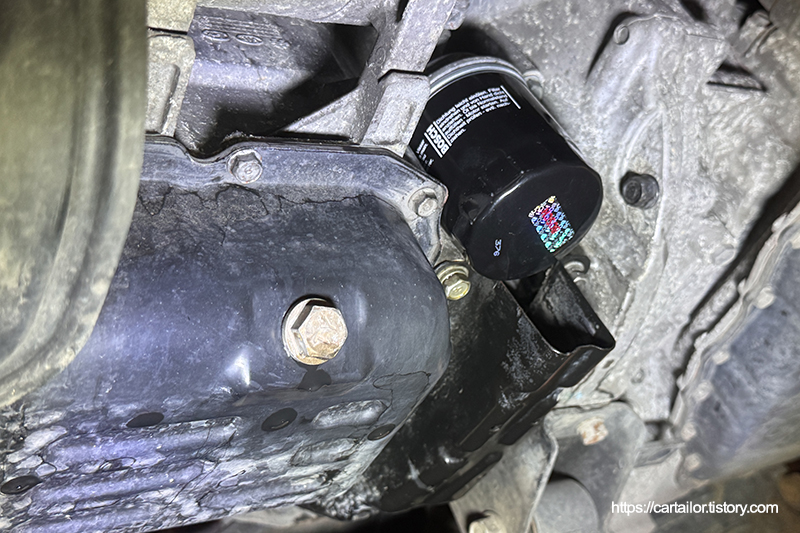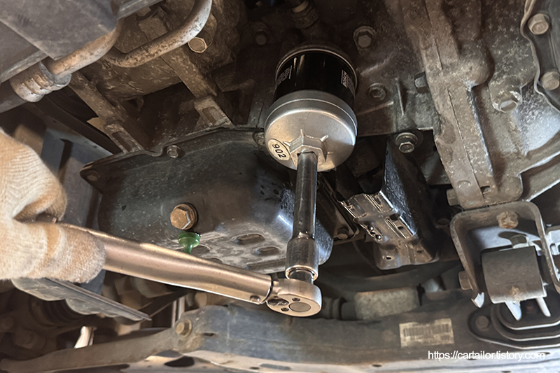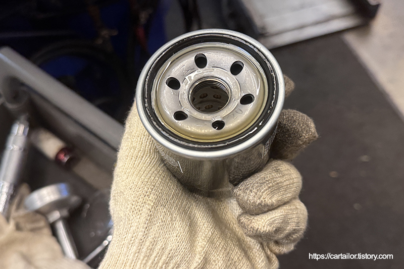 신품 오일필터 씰링에 신유를 바른 후, 토크렌치를 이용해 규정토크로 체결합니다.