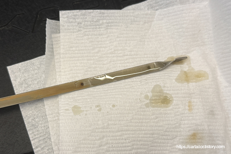 시동을 끄고 수분 후, 딥스틱을 뽑아 레벨을 체크합니다. 정량 잘 충진되었습니다.