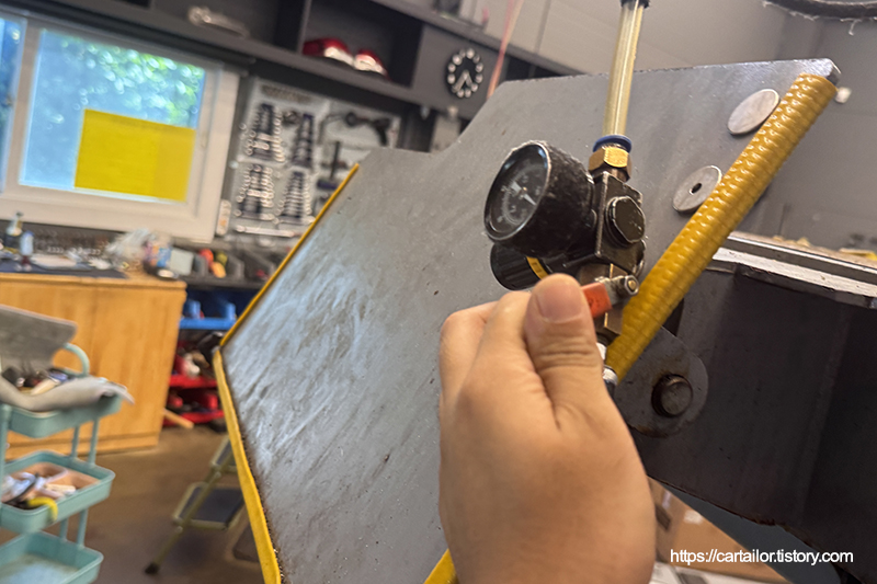 잔유 제거를 위해 전용 어답터 및 호스를 장착 후 차량을 리프팅합니다.