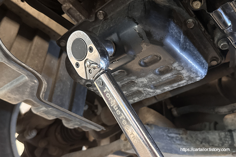 매 교환 시마다 교체해야 하는 드레인플러그 와셔를 신품으로 교환 후, 토크렌치로 정확하게 체결합니다.
