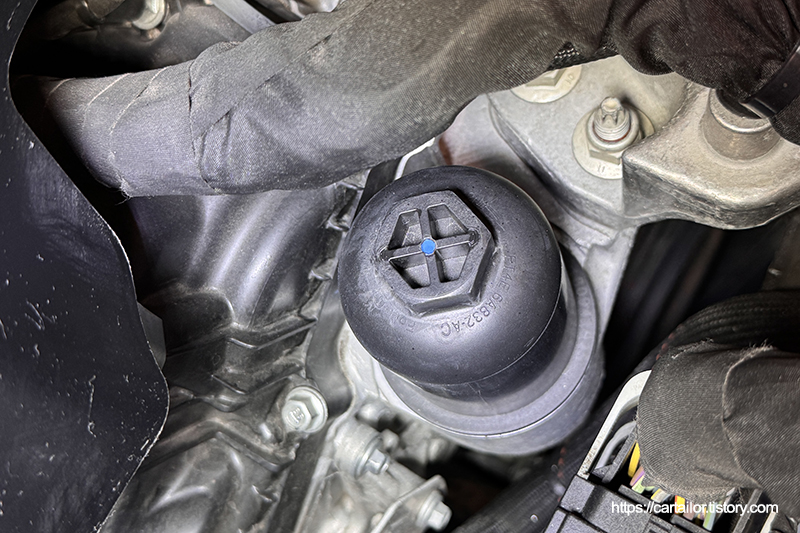 세척 및 건조가 끝난 필터캡에 신품 오링과 필터를 장착합니다 모든 접촉면에는 신유를 발라 윤활한 다음, 토크렌치를 이용해 규정 토크로 체결합니다.
