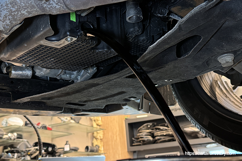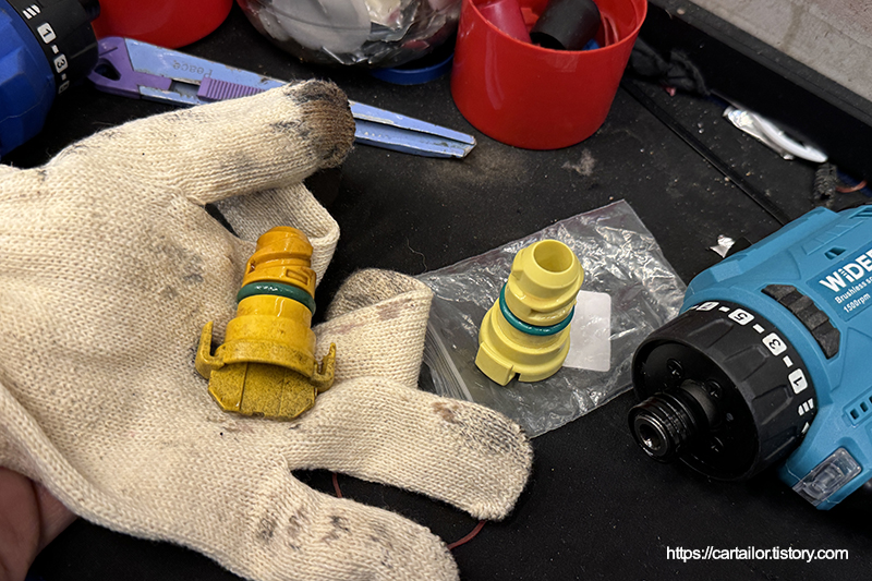 잔유 제거를 위해 에어 호스를 연결 후 차량을 리프팅합니다. 에어클리너의 경우, 습윤필터로 차주분께서 별도로 관리하고 있어 따로 교체하지 않습니다.