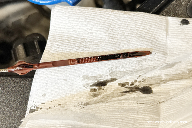 시동을 걸어 신유 순환 및 온도를 상승시킨 후, 웜업 상태에서 시동을 끄고 수분 후 딥스틱을 뽑아 레벨을 체크합니다. 교환 주기를 감안해 의도한 세팅대로 잘 충진되었습니다.
