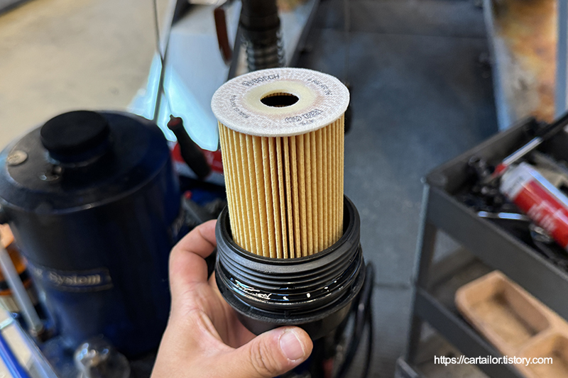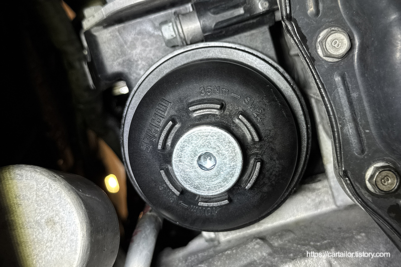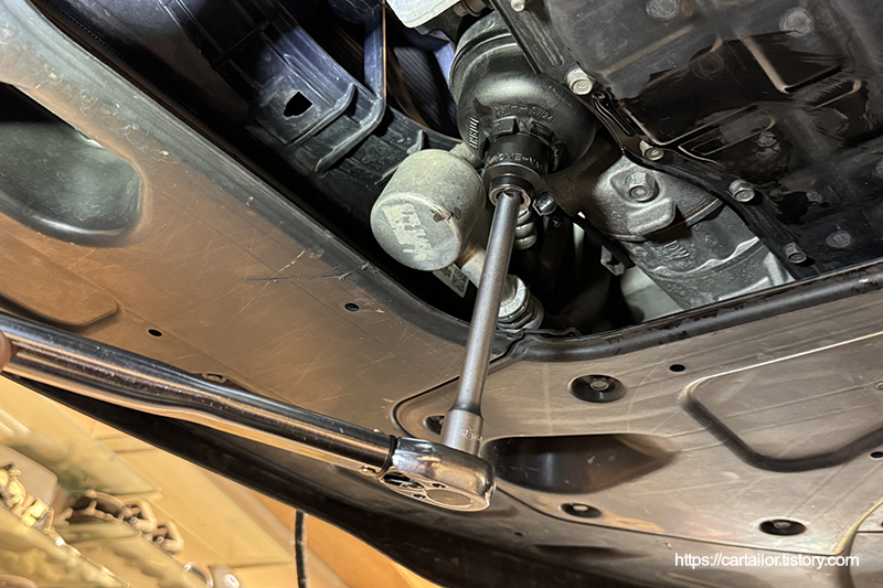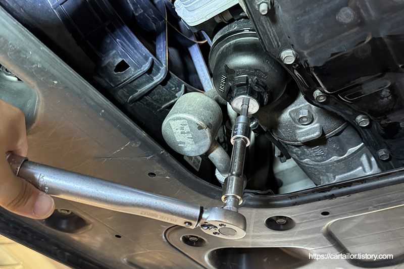 토크렌치를 이용해 필터캡을 규정 토크로 체결한 뒤, 신유를 바른 신품 플러그를 장착합니다. 토크렌치를 이용해 규정 토크로 조여 마무리합니다.