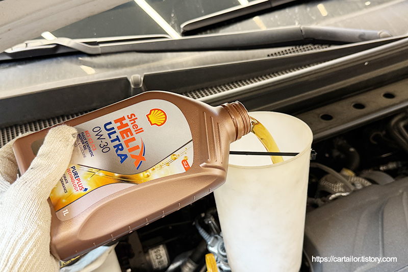 준비한 엔진오일은 쉘 힐릭스 울트라 0W-30(SHELL HELIX ULTRA 0W-30)으로, 베이스유의 전부가 천연가스에서 추출한 성분을 합성하여 생성하는 GTL유로 되어 있습니다. (MSDS상 CAS NO. 848301-69-9) 하지만 GTL기유의 추출기반이 되는 천연가스도 결국 광유를 정재하여 생산되기 때문에 '고순도 VHVI'라는 명칭이 붙기도 하지만 100% 합성유 맞습니다. 오히려 VHVI보다 순도가 높고 저온유동성이 개선된 보다 고가의 양질유임에도 불구하고 별도의 분류법이 없어 일반적인 VHVI와 같이 3기유로 분리 됩니다. 하지만 사실 VHVI와 PAO사이, 어쩌면 PAO 쪽에 더 가깝다 할 수 있는 매우 우수한 기유입니다. 추출 기법의 난이도나 비용도 일반적인 VHVI기유보다 더 높습니다.