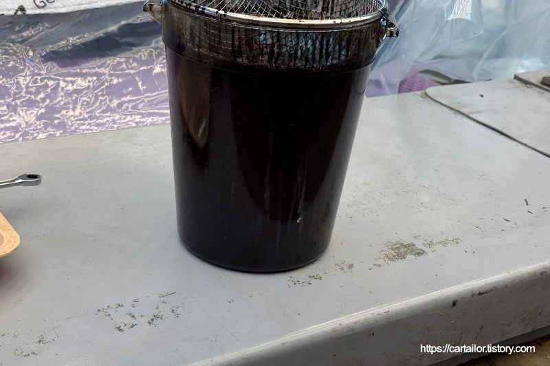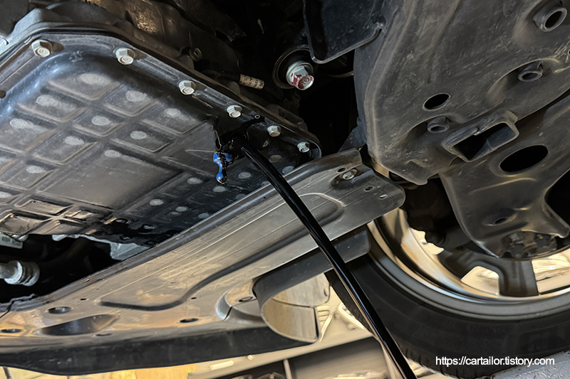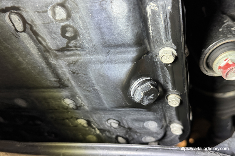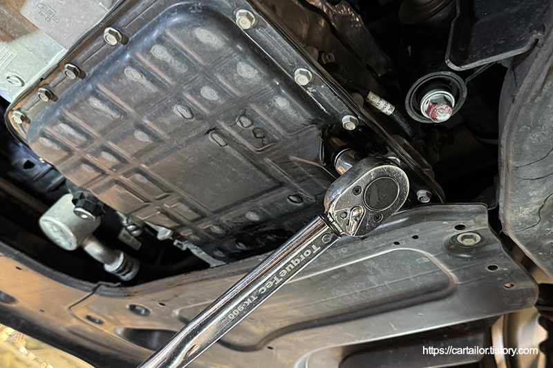 오일 배출이 끝났으면 와셔를 신품으로 교환한 드레인플러그를 손으로 돌려준 뒤, 규정 토크로 조여 줍니다.