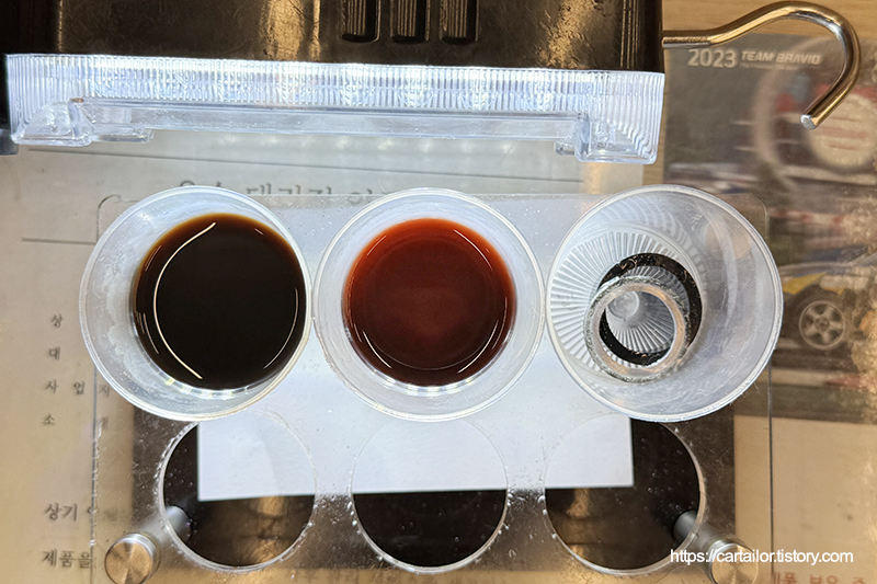 각 단계별로 배출된 오일을 샘플링하여 보다 자세히 관찰해 봅니다. 좌측부터 기존 사용유, 레벨링 시 배출된 미션오일입니다. 우측이 현재 차량의 상태로 보시면 되겠습니다.