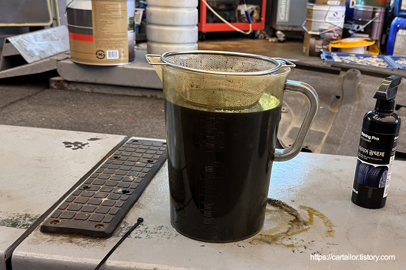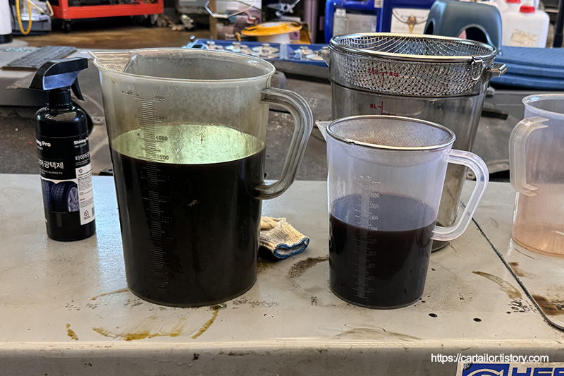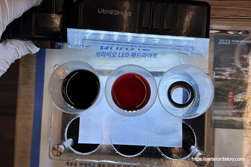 좌측부터 기존 사용유, 레벨링 시 배출된 미션오일을 샘플링한 모습입니다. 우측이 현재 차량의 미션오일 상태로 보시면 되겠습니다.