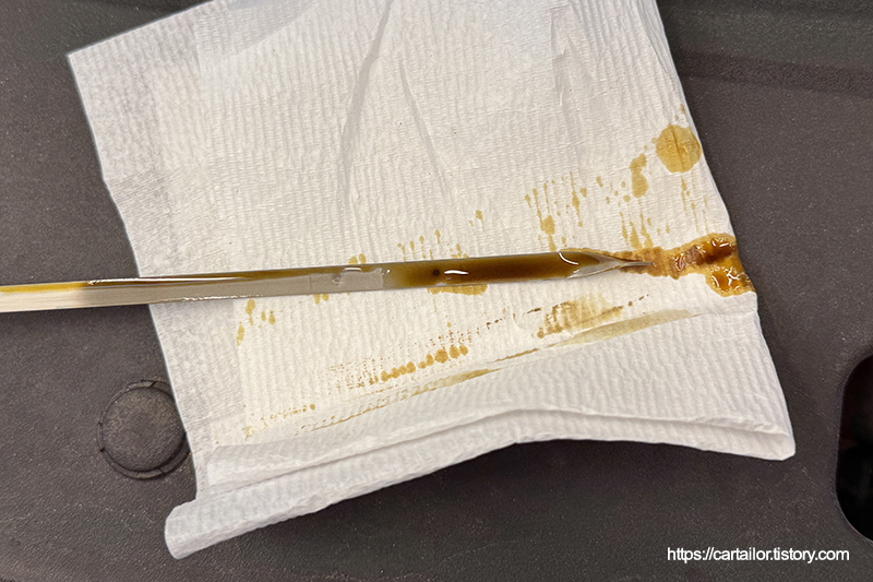 열간 상태에서 시동을 끄고 수분 후, 딥스틱을 뽑아 오일량을 체크합니다. 정량 잘 세팅되었습니다.