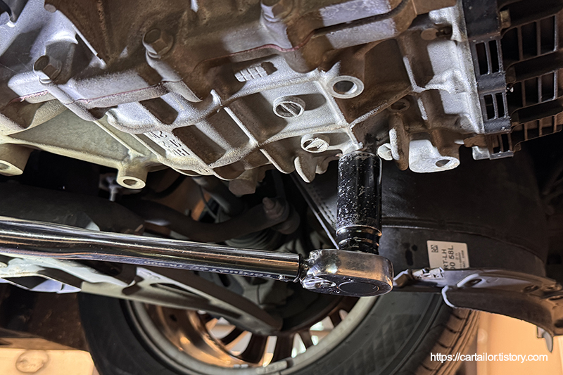 오일 배출이 완전히 끝났으면 플러그를 손으로 돌려준 후, 토크렌치를 이용해 규정 토크로 체결합니다.