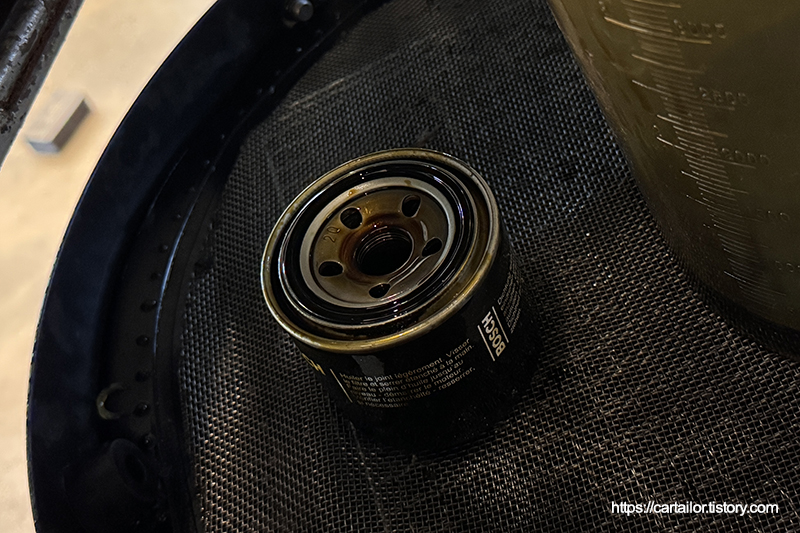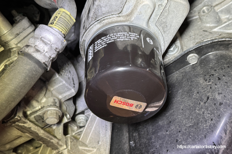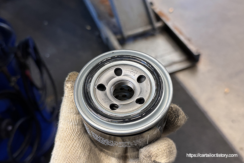 신품 오일필터 오링에 신유를 바른 뒤, 토크렌치를 이용해 규정 토크로 체결합니다.