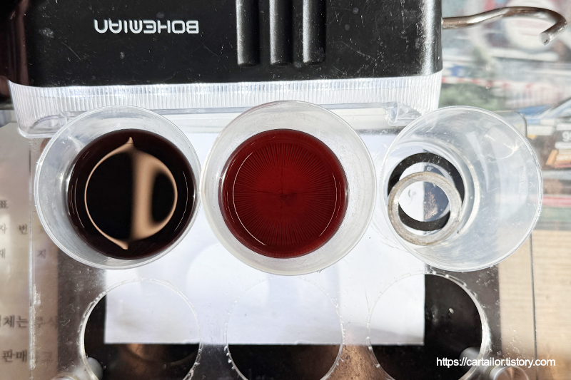 좌측부터 기존 사용유, 레벨링 시 배출된 오일 그리고 교체 후 폐기되는 소모품들입니다. 레벨링 시 배출된 오일이 현재 차량의 미션오일 상태로 보시면 되겠습니다.