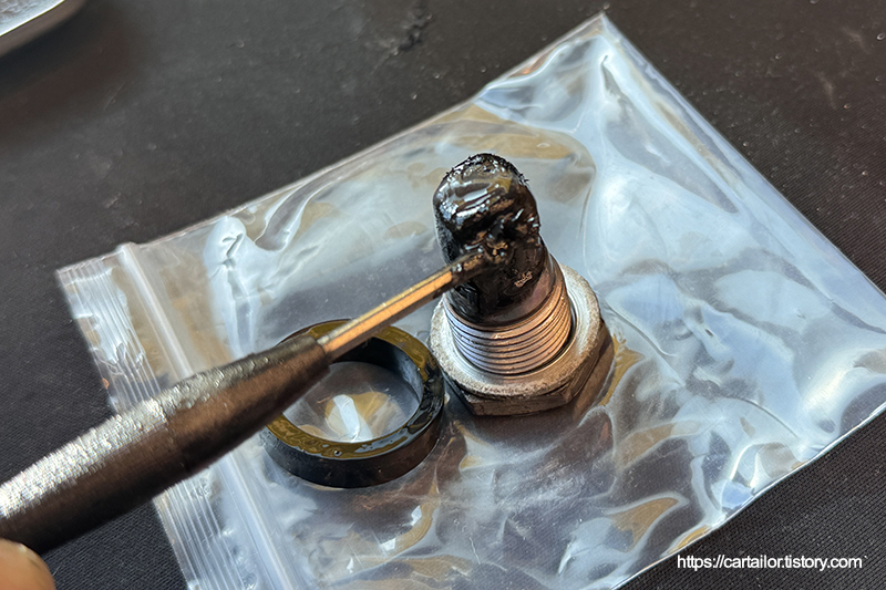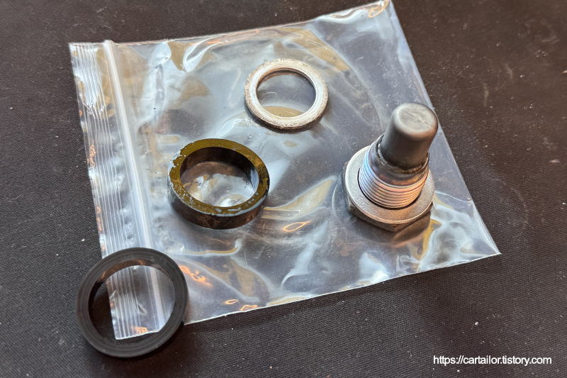 세척이 끝난 플러그에 신품 와셔를 걸어줍니다. 레벨링플러그 오링을 신품으로 준비합니다.
