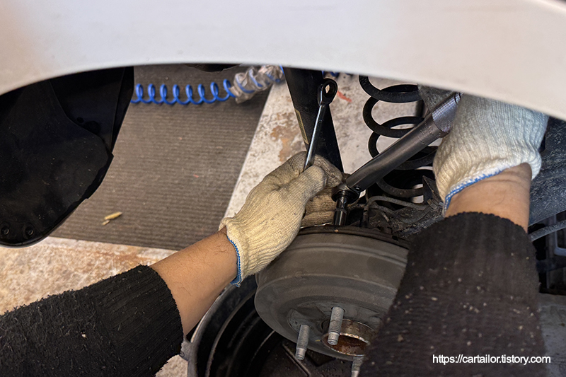 탈거했던 휠을 장착 후, 토크렌치를 이용해 모든 고정 너트들을 규정 토크로 체결합니다.