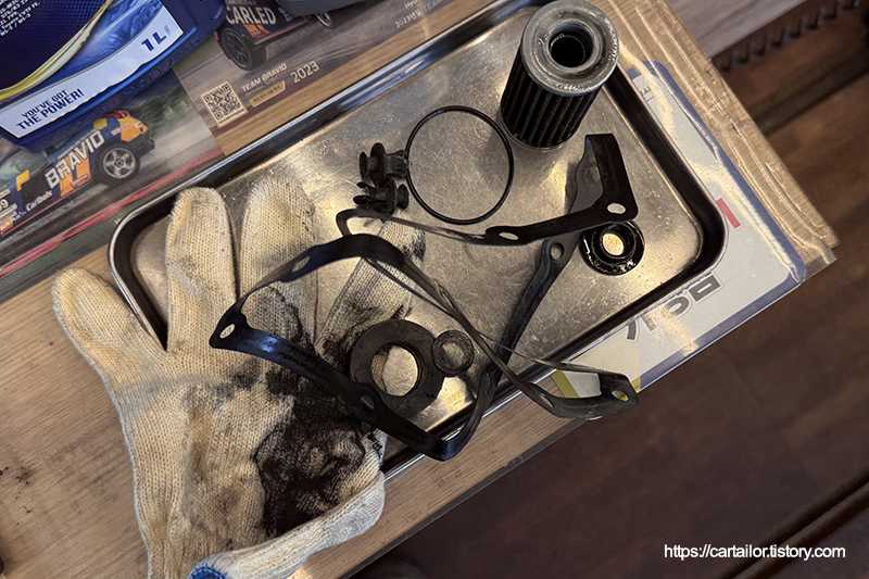 교체될 쉐보레 부품들의 모습입니다. 타 차종의 변속기액 교환 때와 비교하면 자잘한 부품이 많이 필요한 편입니다.