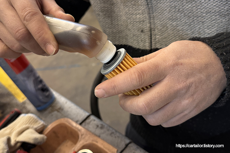 신품 필터 씰링과 세척을 마친 필터캡 하우징에 신유를 바른 신품 씰링을 걸어줍니다.