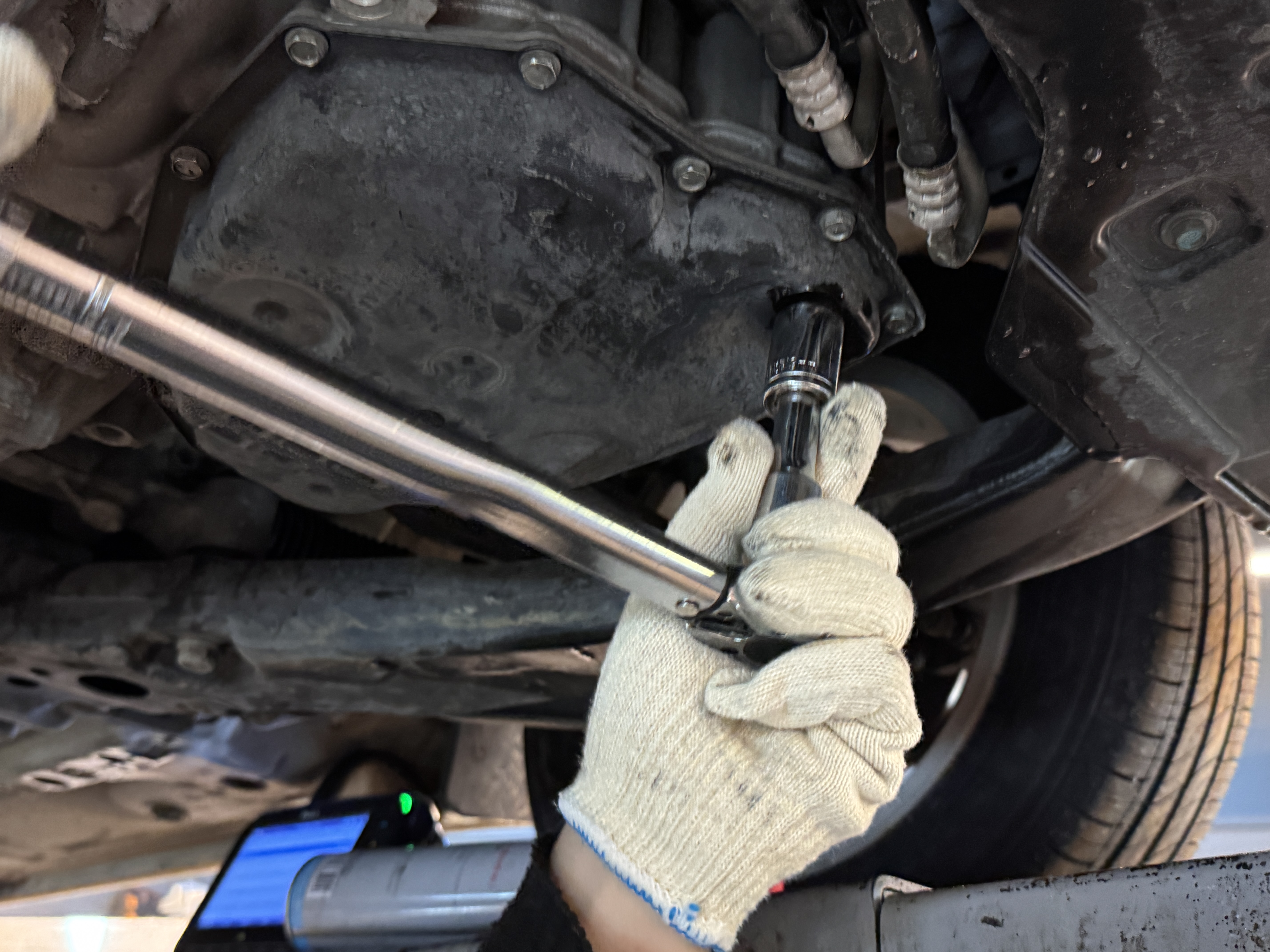 토크렌치를 이용해 드레인플러그를 규정 토크로 체결합니다.