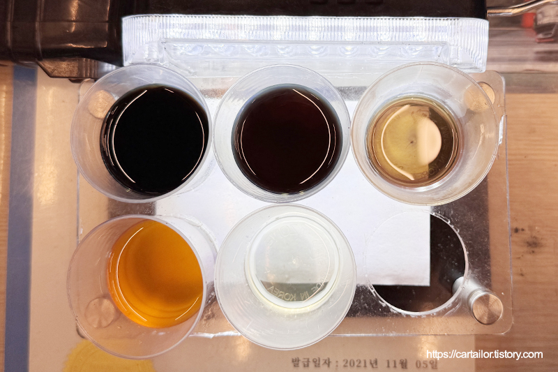 상단 좌측부터 1차, 2차 그리고 레벨링 시 배출된 CVT오일입니다. 가장 우측이 현재 차량의 변속기 오일 상태로 보시면 되겠습니다. 하단 좌측은 기존 브레이크액, 우측은 신유를 샘플링한 모습입니다.